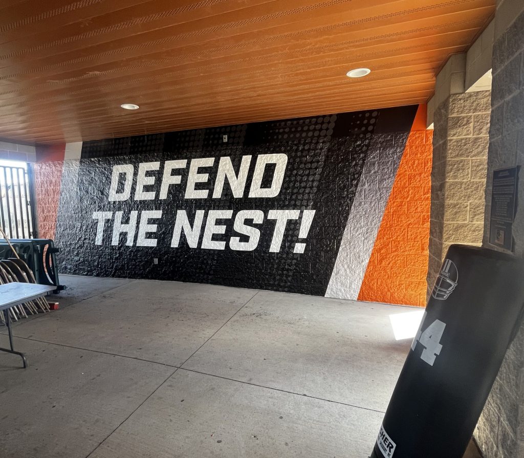 The rollout required consistency across multiple schools, municipalities, and facility types — each with different architectural conditions, materials, and usage patterns. Graphics needed to perform across fences, cinderblock walls, panels, interior walls, exterior surfaces, and even mobile assets, while maintaining a cohesive look tied to the district’s overarching identity.